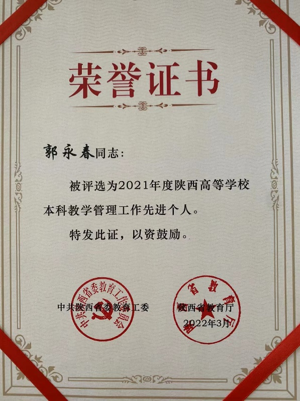 PA视讯郭永春同志被陕西省委教育工委评选为2021年度陕西高等学校本科教学管理工作先进个人。表彰他在2021年度的工作表现。