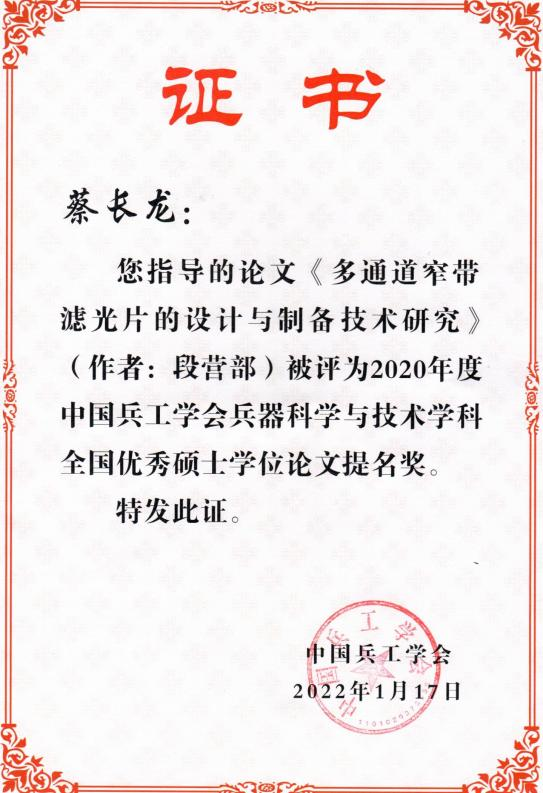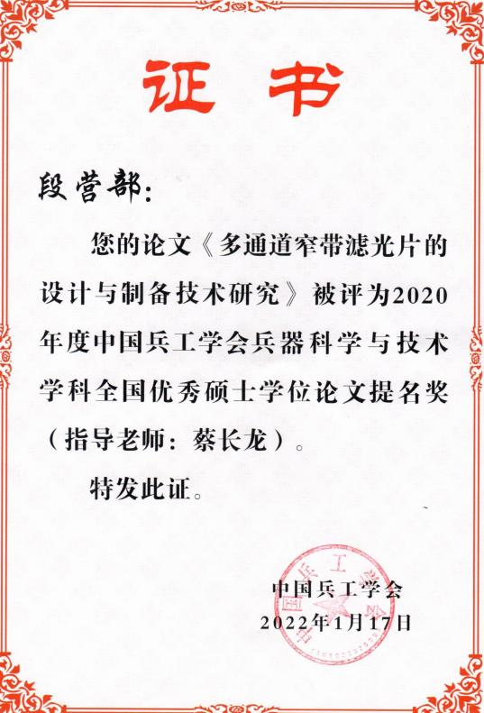 2022年1月17日,中国兵工学会公布了第五届兵器科学与技术学科全国优秀博士、硕士学位论文评选结果。本次评选共评出19篇优秀学位论文及提名奖,其中优秀博士学位论文4篇,优秀博士学位论文提名奖4篇,优秀硕士学位论文10篇,优秀硕士学位论文提名奖1篇。PA视讯兵器科学与技术学科硕士生段营部的硕士学位论文“多通道窄带滤光片的设计与制备技术研究”荣获优秀硕士学位论文提名奖,这是PA视讯首次获此殊荣。