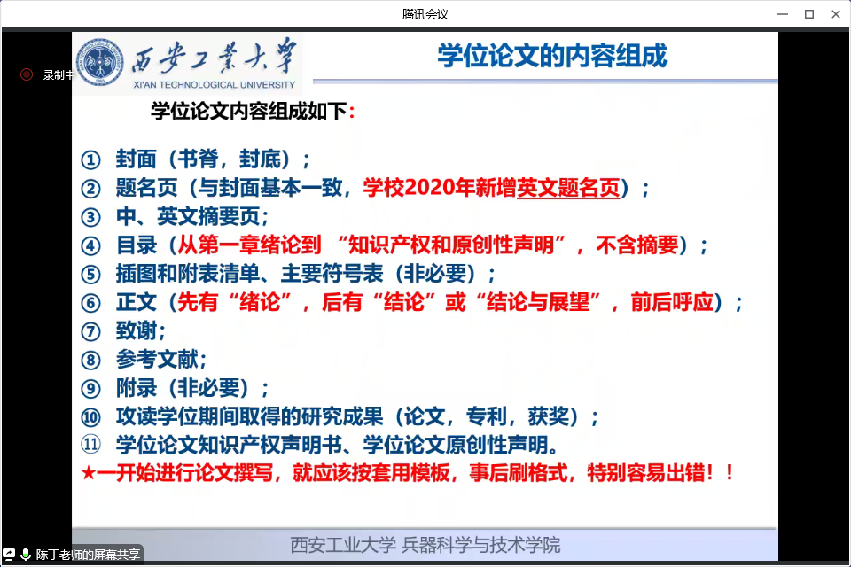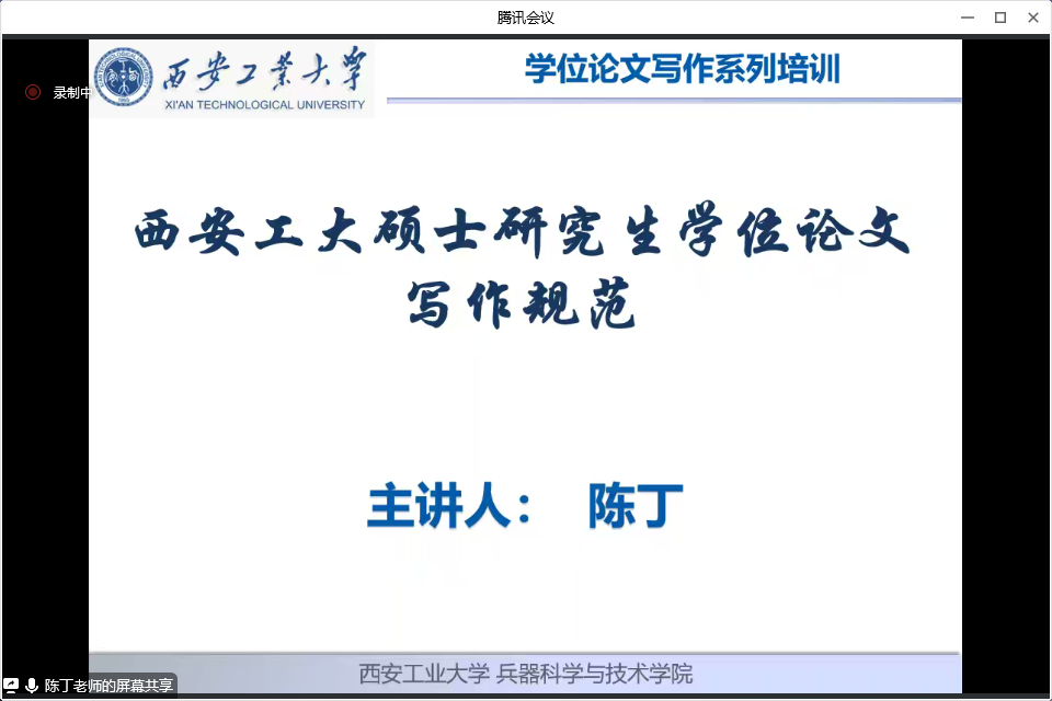 讲座题目:西安工大硕士研究生学位论文写作规范,主讲人:陈丁,博士、高级工程师、硕士生导师。主要研究方向:兵器数字化试验测试技术、雷达系统总体设计与建模。中国电子学会高级会员、中国仪器仪表学会高级会员、IEEE会员,多个SCI及中文核心期刊评审专家。发表学术论文90余篇,其中SCI、EI收录20余篇。多次获得相关学术会议、科技成果奖。