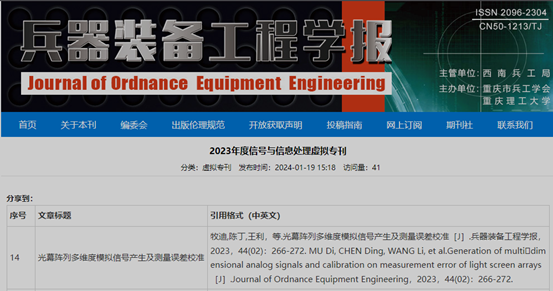 PA视讯20级兵器科学与技术学科硕士生牧迪在《兵器装备工程学报》期刊发表的论文—“光幕阵列多维度模拟信号产生及测量误差校准”,近日经优选后被收录进《兵器装备工程学报》2023年度信号与信息处理虚拟专刊。该论文主要阐述了一种多维度模拟信号产生方法可实现对弹丸多个飞行参数测量结果进行有效的校准,该方法可使校准误差小于1mm,且在校准精度、实验效率、安全性、运行成本等方面具有优势。2023年度信号与信息处理虚拟专刊网址:https://bzxb.cqut.edu.cn/newsinfo.aspx?id=1458