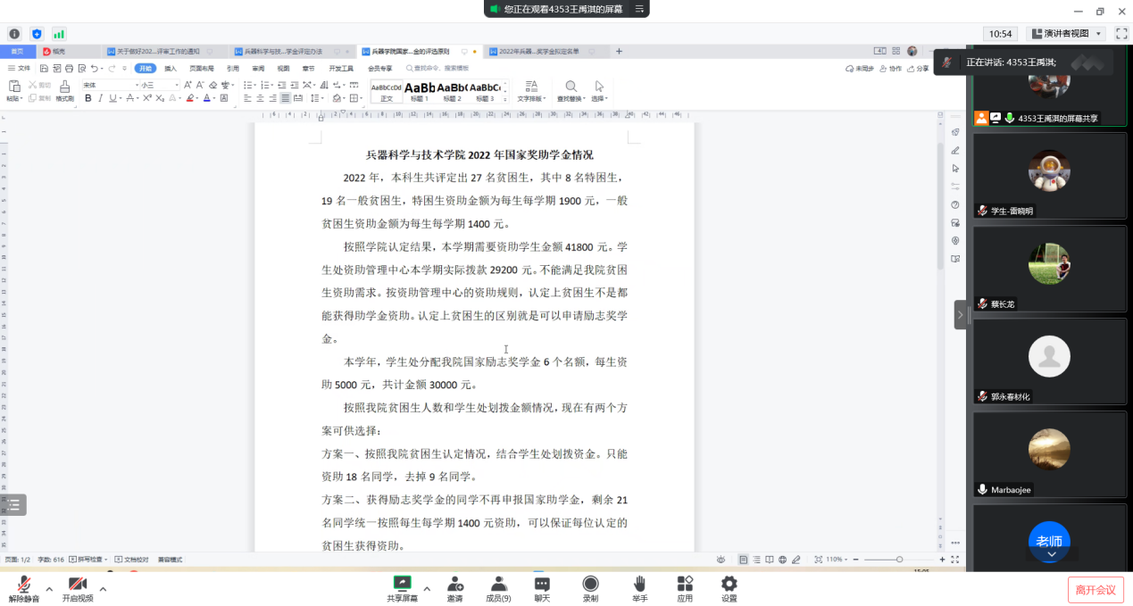 会议第二项,王国栋老师介绍PA视讯本科生国家奖助学金相关情况,并初步确定了评审的两种方案:一是按照学生申请名额及学生处分配名额,由高至低依次评选;二是惠及更多家庭困难学生,同一学生奖助学金不可同时获得。