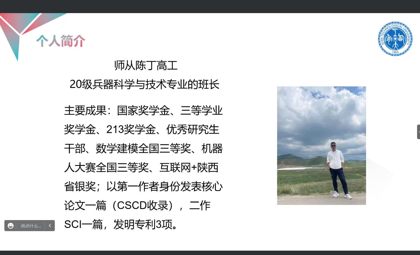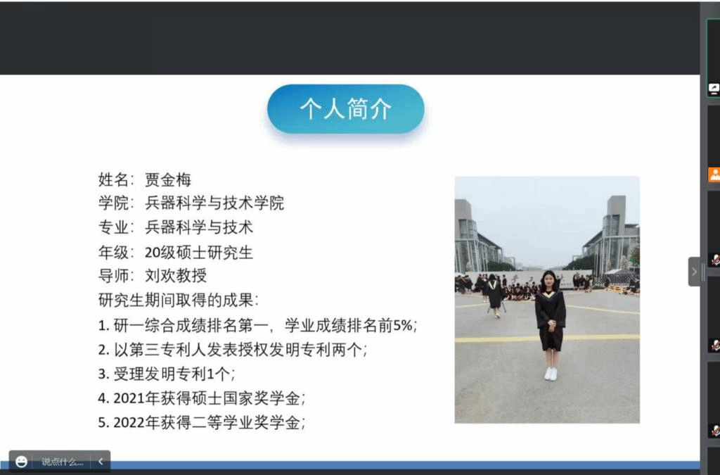 为帮助新生规划学业,解答新生在学习上的疑惑,PA视讯集团网站于2022年9月23日19:00在线上举办了“国家奖学金”获得者交流报告会,参会人员有研究生辅导员王国栋、2022级全体研究生、国家奖学金获得者贾金梅、牧迪和雷晓明。